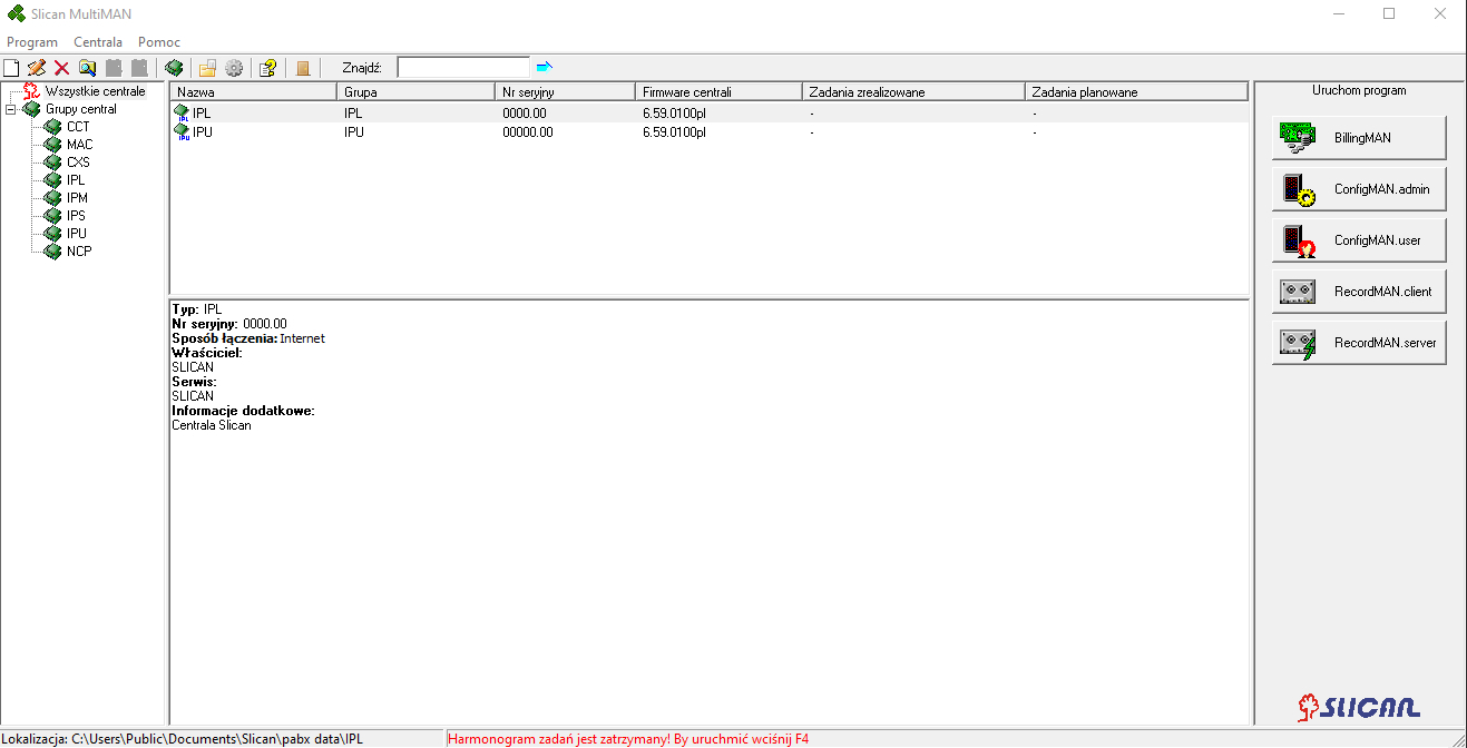 Slican MultiMAN – aplikacja dla administratora wielu central. Serwis, który zarządza często dziesiątkami PBX dzięki MultiMAN organizuje i porządkuje różne informacje o centralach. MultiMAN jest podstawowym narzędziem dla każdego serwisu pracującego z więcej niż z jedną centralą. Jest przyjaznym narzędziem, które systematyzuje sieć central i ułatwia pracę.
